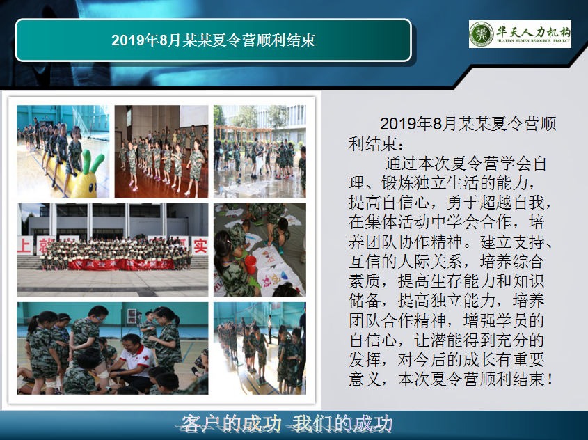 通過(guò)本次夏令營(yíng)學(xué)會(huì)自理、鍛煉獨(dú)立生活的能力,提高自信心,勇于超越自我,在集體活動(dòng)中學(xué)會(huì)合作,培養(yǎng)團(tuán)隊(duì)協(xié)作精神。建立支持、互信的人際關(guān)系,培養(yǎng)綜合素質(zhì),提高生存能力和知識(shí)儲(chǔ)備,提高獨(dú)立能力,培養(yǎng)團(tuán)隊(duì)合作精神,增強(qiáng)學(xué)員的自信心,讓潛能得到充分的發(fā)揮,對(duì)今后的成長(zhǎng)有重要意義,本次夏令營(yíng)順利結(jié)束!