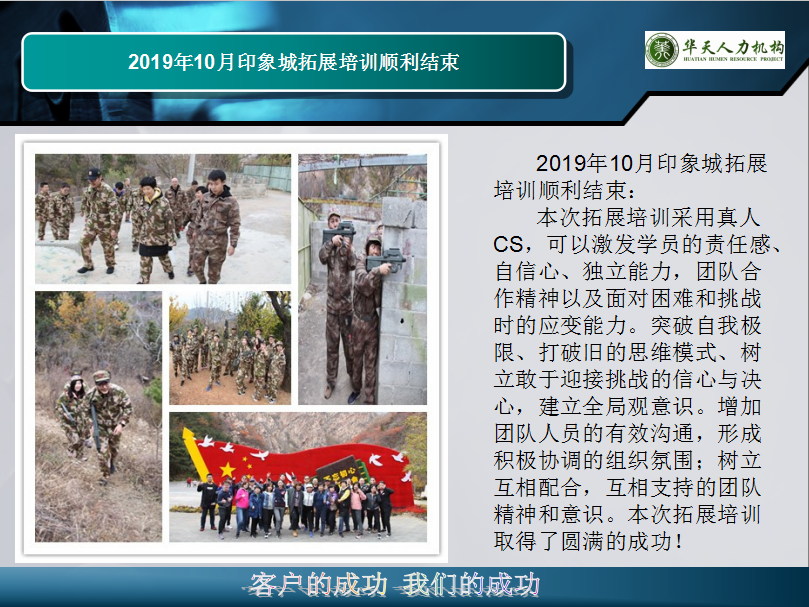 本次拓展培訓(xùn)采用真人CS,可以激發(fā)學(xué)員的責(zé)任感、自信心、獨(dú)立能力,團(tuán)隊(duì)合作精神以及面對(duì)困難和挑戰(zhàn)時(shí)的應(yīng)變能力。突破自我極限、打破舊的思維模式、樹立敢于迎接挑戰(zhàn)的信心與決心,建立全局觀意識(shí)。增加團(tuán)隊(duì)人員的有效溝通,形成積極協(xié)調(diào)的組織氛圍;樹立互相配合,互相支持的團(tuán)隊(duì)精神和意識(shí)。本次拓展培訓(xùn)取得了圓滿的成功!